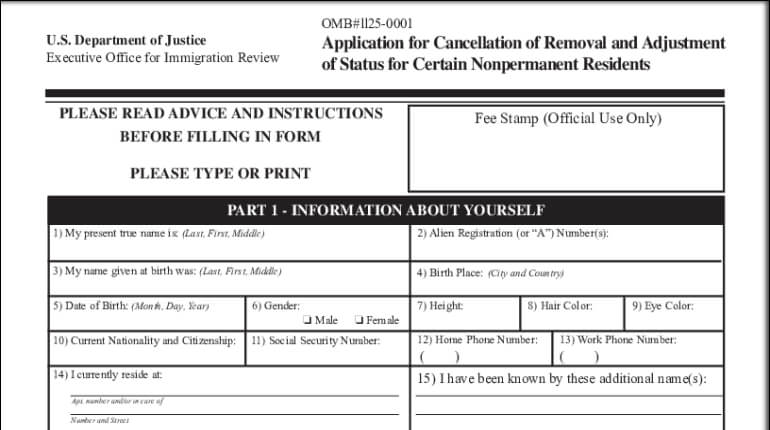 - Cancelación de Remoción para Residentes Permanentes, INA – Una persona debe probar la admisión legal para obtener la residencia permanente por no menos de 5 años. Además, debe probar 7 años de residencia continua en los EE. UU. después de la admisión en cualquier estado; y, no tener condena por delitos graves agravados.